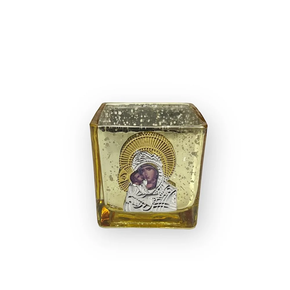 Γυάλινο τετράγωνο καντήλι οικίας με εικόνα της Παναγίας και του Χριστού.